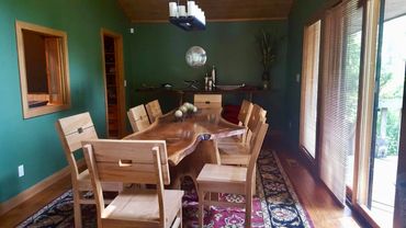 The master bedroom features a custom-made platform bed with therapeutic mattress, Jacuzzi tub in the en-suite bathroom, with a shower and Jack and Jill sink. Spacious room with additional seating, large flat-screen TV and space to set up a small work area.